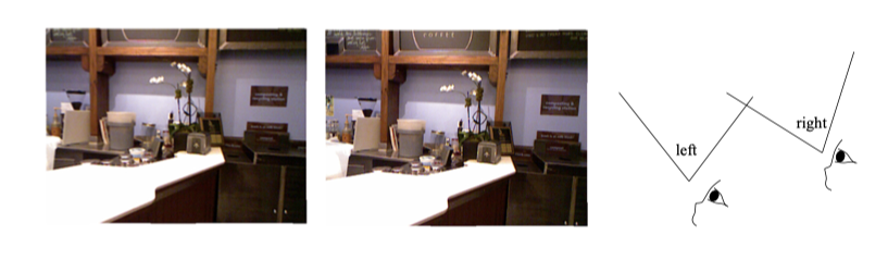 단안 카메라로 찍은 이미지는 3차원 공간의 2차원 투영이므로, 실제로 3차원 구조를 복원하려면 카메라의 시점을 변경해야 합니다. 단안 SLAM문제에서도 같은 원리가 적용됩니다. 카메라를 움직여 움직임을 추정하고 장면에서 물체의 거리와 크기를 추정해야 합니다. 그렇다면 이러한 움직임과 물체의 정보를 어떻게 추정할 수 있을까요? 인간의 시각에서는, 선험적인 경험으로부터 우리는 카메라가 오른쪽으로 움직인다면 이미지의 물체들이 왼쪽으로 움직일 것이라는 것을 이미 알고 있습니다. 이것은 우리에게 움직임에 대한 추측에 대한 직관을 줍니다. 또한, 멀리 떨어진 거리의 물체에 대해서는 천천히 움직이는 반면 주변의 물체는 빠르게 움직이며 카메라가 움직이면 이미지의 물체의 움직임은 시차(disparity)를 형성합니다. 바로 이 시차를 통해 우리는 어느 물체가 멀리 떨어져 있고 어느 물체가 가까운지를 결정할 수 있습니다.