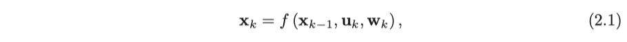 여기에서 $\mathbf{u}_k$는 움직임 명령 입력이고 $\mathbf{w}_k$는 노이즈입니다. $f(\cdot)$는 운동 모델을 나타내는 함수입니다. 이를 통해 함수가 특정 움직임 명령 입력으로 제한되지 않고 모든 움직임 명령 입력을 나타낼 수 있습니다. 우리는 이를 운동 방정식이라고 부릅니다.