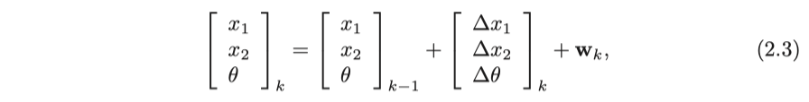 여기서 $\mathbf{w}_k$는 노이즈에 대한 항입니다. 그러나 입력 명령이 위치 및 각도 변경만 있는 것은 아닙니다. 예를 들어, 가속 페달은 가속도를 나타내므로 더 복잡한 모션 방정식의 형태가 있습니다. 그러한 경우 로봇에 대한 운동 분석이 필요할 것입니다.