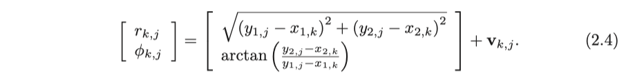 여기서 $\mathbf{v}_{k,j}$는 이 관찰에서의 노이즈입니다. 관측에 사용되는 센서는 형태가 다양하므로 관측값 $\mathbf{z}$와 관측 방정식 $h$는 여러 가지 형태로 존재합니다.