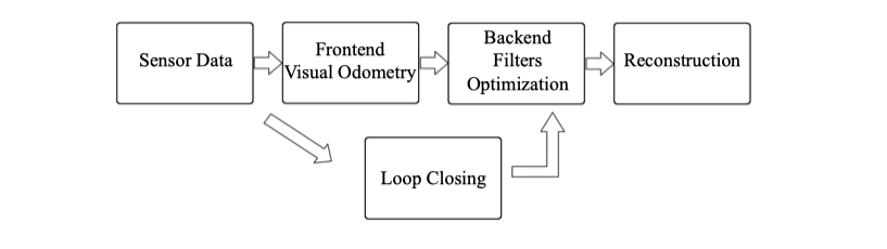 다음 단계들은 전형적인 Visual SLAM을 구성하는 모듈입니다.