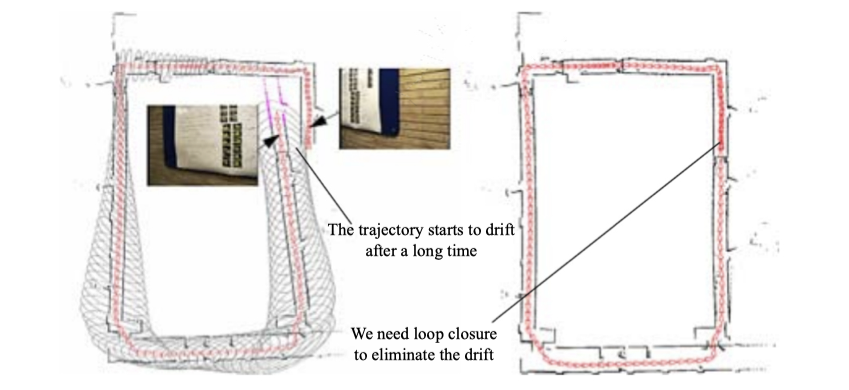 이것은 drift problem이라고 합니다. 이 때문에 일관된 전체 지도를 만들 수 없게 됩니다. 위 그림을 통해 처음에 만들어진 일자로 쭉 뻗어진 복도가 누적된 에러로 인해 나중에는 기울어졌음을 알 수 있습니다. 이러한 드리프트 문제를 해결하려면 Backend optimization 및 Loop closure detection의 두 가지 기술이 필요합니다. Loop closure detection는 "로봇의 현재 위치가 이전에 방문했던 곳인가 "를 감지하는 기술이고 Backend optimization는 이 정보를 기반으로 전체 궤적의 모양을 수정합니다.