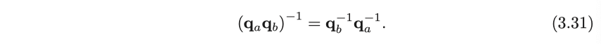 q가 단위 쿼터니언이면 이것의 inverse와 conjugate는 같습니다. 동시에 곱셈의 inverse는 행렬과 비슷한 특성을 갖습니다.
