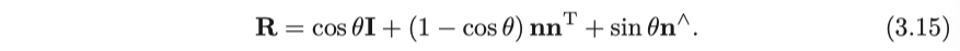 사실, 회전 벡터는 다음 장에서 소개할 Lie 대수학과 관련이 있습니다. 이 내용은 다음 장을 위해 남겨 둡시다. 이 장에서 독자는 회전이 그렇게 표현될 수 있다는 것만 알고 넘어가면 됩니다. 회전 행렬 R로 표시되는 회전을 고려해봅시다. 회전축이 단위 길이 벡터 n이고 각도가 θ라고 가정하고 회전 벡터로 설명하면 벡터 θn은 회전을 설명할 수 있습니다. 그래서 우리는 두 표현의 사이의 연관성이 무엇인지 물어봐야 합니다. 사실, 그들의 전환 관계를 도출하는 것은 어렵지 않습니다. 회전 벡터에서 회전 행렬로의 변환 프로세스는 Rodrigues의 공식으로 표시됩니다. 하지만 유도 과정이 더 복잡하기 때문에 이를 설명하지 않고 변환 결과만 제공합니다.
