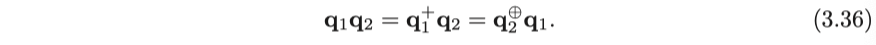 이 곱셈 정의에서 두 개의 real 쿼터니언 곱은 여전히 실수이며 실수에서의 곱셈과도 일치합니다. 그러나 마지막 외적의 존재로 인해, $ \mathbf {v}_a $와 $ \mathbf {v}_b $가 $ \mathbb {R}^ 3 $공간에서 평행하지 않으면 쿼터니언 곱셈은 일반적으로 교환 법칙이 성립하지 않습니다. 그러면 외적항은 0이 됩니다.