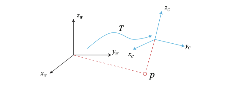 우리는 종종 실제 환경에서 다양한 좌표계를 정의합니다. 로봇 공학에서는 각 링크와 관절에 대해 하나의 좌표계를 정의하고 3D 매핑에서는 각 입방체와 원통에 대한 좌표계도 정의합니다. 움직이는 로봇을 고려하면 그림 3-1에 정의된 $x_W, y_W, z_W$와 같이 고정된 것으로 간주할 수 있는 관성 좌표계 (또는 세계 좌표계)를 설정하는 것이 일반적입니다. 동시에 카메라 또는 로봇은 $x_C, y_C, z_C$로 정의된 좌표계와 같은 움직이는 좌표계입니다. 우리는 다음과 같은 질문을 할 수 있습니다. 카메라 좌표계에서 볼 수 있는 포인트 p는 카메라 좌표계에서 좌표 $\mathbf{p}_c$를 가지고 있습니다. 그리고 세계 좌표계에서 좌표는 $ \mathbf {p}_w$입니다. 그러면 이 두 좌표 간의 변환은 어떻게 될까요? 이때 먼저 로봇의 카메라 좌표계에서 포인트의 좌표 값을 구한 다음 로봇의 카메라 포즈를 활용해 세계 좌표계로 변환해야 합니다. 이 변환을 설명하는 수학적 방법이 필요합니다. 나중에 살펴 보겠지만 우리는 행렬 T로 설명할 수 있습니다.