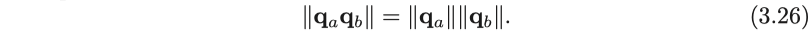 쿼터니언 곱셈의 크기는 각 쿼터니언의 크기의 곱셈인 것을 확인할 수 있습니다. 이렇게 하면 단위 쿼터니언에 다른 단위 쿼터니언을 곱할 때 단위 길이를 유지하게 합니다.