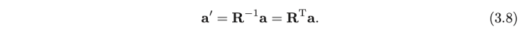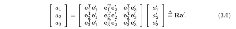 이러한 유클리드 변환은 회전과 변환의 두 부분으로 구성됩니다. 먼저 회전을 고려해봅시다. 우리는 단위 길이의 정규 직교 기저 $ ( \mathbf {e}_ 1, \mathbf {e}_ 2, \mathbf {e}_ 3 ) $ 설정하고 이 기저의 회전 후를 $ ( \mathbf {e}_ 1 ', \mathbf {e}_ 2 ', \mathbf {e}_ 3 ') $로 설정할수 있습니다. 그런 다음 동일한 벡터 a에 대해 각각의 두 좌표계에서의 좌표는 $ [a_ 1, a_ 2, a_ 3 ] ^ \mathrm {T} $ 와 $[a'_ 1, a'_ 2, a'_ 3 ]^ \mathrm {T} $로 나타낼 수 있습니다.