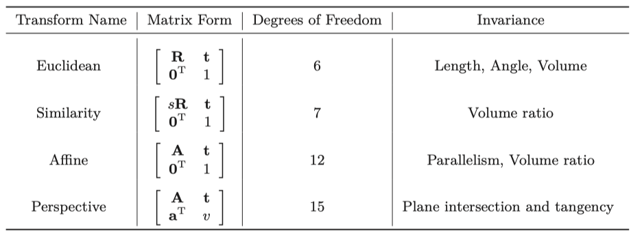 표 3-1에는 현재 다루는 여러 변환의 속성이 요약되어 있습니다. "Invariance"에는 위에서 아래로 포함 관계가 있습니다. 예를 들어, 볼륨을 유지하는 것 외에도 유클리드 변환은 parallelism, intersection 등의 속성을 갖습니다.