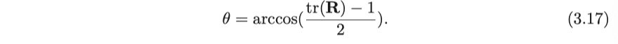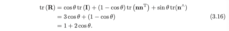 따라서 회전축 n은 행렬 R의 eigen value가 1에 해당하는 eigen vector입니다. 이 방정식을 풀고 정규화하면 회전축을 얻을 수 있습니다. 독자는 "회전축이 회전한 후에도 변하지 않습니다"라는 기하학적 점에서 이 방정식을 볼 수 있습니다. 여기에 있는 두 가지 변환 공식은 여전히 다음 장에서 설명할 것이며, 당신은 Lie 그룹과 Lie 대수학의 SO (3)에 대한 일치임을 알게 될 것입니다.