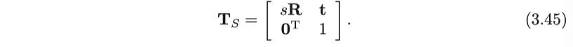 유사 변환은 Euclidean 변환보다 하나 더 많은 자유도를 더 가집니다. 객체의 크기가 일정하게 조정될 수 있으며 매트릭스 표현은 다음과 같습니다.