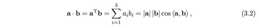 기본적인 선형 대수학 지식을 바탕으로 벡터와 벡터, 벡터와 숫자 사이의 연산, 예를 들어 숫자 곱하기, 더하기, 빼기, 내적 곱, 외적 곱 등에 대해 이야기할 수 있습니다. 곱셈과 네 가지 연산은 아주 기본적이므로 여기서 반복하지 않습니다. $ \mathbf {a}, \mathbf {b} \in \mathbb {R}^ 3 $의 경우 $\mathbf{a}, \mathbf{b}$의 내적은 다음과 같이 쓸 수 있습니다.