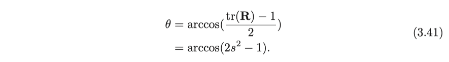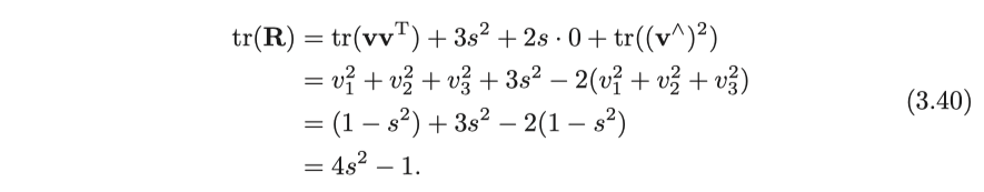 쿼터니언에서 회전 벡터로의 변환 공식을 얻기 위해 위 공식의 양쪽에서 트레이스를 취합니다.