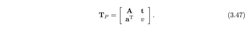 행렬의 왼쪽 위는 가역 행렬 A이고, 오른쪽 위는 변환 t이고, 왼쪽 아래는 스케일링 $\mathbf{a}^\mathrm{T}$이다. 우리가 동차 좌표를 사용하기 때문에, $v \neq 0$일 때, 전체 행렬을 $v$로 나눔으로써 오른쪽 하단 모서리가 1 인 행렬을 얻을 수 있고, 그렇지 않으면 우리는 오른쪽 하단 모서리가 0 인 행렬을 얻을 수 있습니다. 따라서 2D 투영 변환은 총 8 자유도를 가지며 3D는 총 15 자유도를 갖습니다. 투영 변환은 지금까지 말한 변형의 가장 일반적인 형태입니다. 실제 세계에서 카메라 사진으로의 변환은 투영 변환으로 볼 수 있습니다. 독자는 사진에서 정사각형 타일이 어떻게 생겼는지 상상할 수 있습니다. 이는 더 이상 정사각형이 아닙니다. 가까운 부분이 먼 부분보다 더 크기 때문에 평행 사변형이 아니라 불규칙한 사변형의 형태가 됩니다.