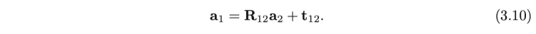 여기서 t는 이동 벡터라고 합니다. 회전과 비교하여 변환 부분은 단순히 회전 후 좌표에 변환 벡터를 추가하기 때문에 매우 간단합니다. 위의 공식으로 회전 행렬 R과 평행 이동 벡터 t를 사용하여 유클리드 공간의 좌표 변환 관계를 완전히 설명합니다. 우리는 좌표계 1과 좌표계 2를 정의하고 각각의 두 좌표계 아래의 벡터 a는 $ \mathbf{a}_1, \mathbf{a}_2 $로 표현되며 둘 사이의 관계는 다음과 같아야 합니다.