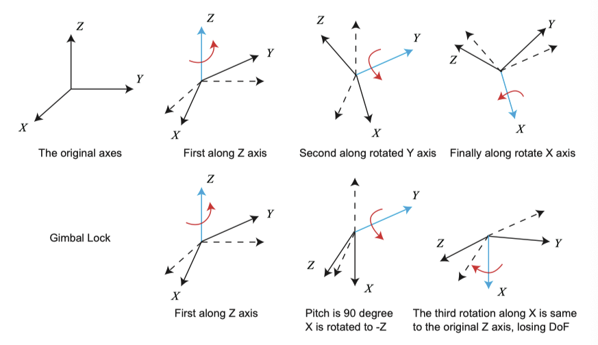 회전 행렬이나 회전 벡터는 회전을 설명할 수 있지만 인간에게는 직관적으로 잘 와 닿지 않습니다. 회전 행렬 또는 회전 벡터를 볼 때 이 회전이 무엇인지 상상하기 어렵습니다. 그들이 변화할 때 우리는 물체가 어느 방향으로 돌고 있는지 알지 못합니다. 이때, 오일러 각은 회전을 설명하는 매우 직관적인 방법을 제공합니다. 3개의 기본 축을 사용하여 회전을 다른 축을 중심으로 3 개의 회전으로 분해합니다. 인간은 단일 축을 중심으로 회전하는 과정을 쉽게 이해할 수 있습니다. 그러나 다양한 분해 방법으로 인해 오일러 각도에 대해 다양하고 혼란스러운 정의 방법이 많이 있습니다. 예를 들어, 먼저 X 축을 중심으로 회전 한 다음 Y 축을 중심으로, 마지막으로 Z 축을 중심으로 회전할 수 있습니다. 이렇게 하면 XYZ 순서와 같은 회전을 얻을 수 있습니다. 마찬가지로 ZYZ 및 ZYX와 같은 회전 순서를 정의할 수 있습니다. 또한 고정 축을 중심으로 회전하는지 아니면 회전 후 축을 중심으로 회전하는지 구별해야 합니다. 그러면 다른 정의도 제공됩니다.
