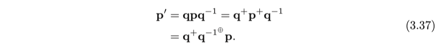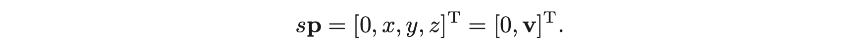 먼저, 3차원 점은 imaginary 쿼터니언으로 표현됩니다. 그러면 회전된 점 $ \mathbf {p}' $는 다음과 같은 곱셈으로 표현될 수 있습니다.