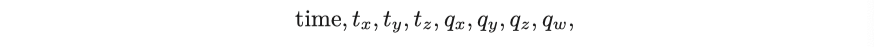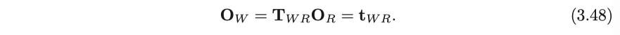 이는 정확히 $ \mathbf {T}_{WR} $의 이동 변환 부분입니다. 따라서 우리는 $ \mathbf {T}_{WR} $ 수식으로부터 카메라가 공간상에서 어디에 있는지 정확히 알 수 있습니다. 따라서 대부분의 공개 데이터 세트에서 궤적 파일은 $ \mathbf {T}_{RW} $ 대신 $ \mathbf {T}_{WR} $을 저장합니다.