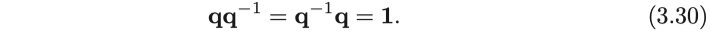 이 정의에 따르면, 쿼터니언과 그 inverse의 곱은 실수 쿼터니언 $ \mathbf {1} $입니다.