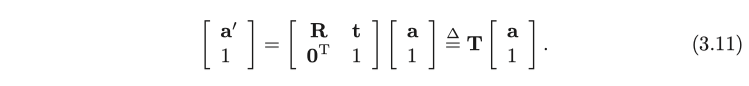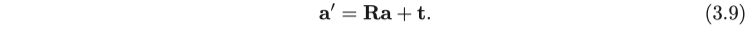 유클리드 변환에는 회전 이외에 이동 변환이 있습니다. 세계 좌표계에서 벡터 a를 생각해봅시다. 회전 R과 이동 t에 의해 변환된 벡터 a’가 다음과 같이 계산될 수 있습니다.