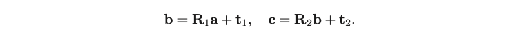 식 (3.9)은 유클리드 공간의 회전과 변환을 완전하게 표현하지만, 여기에서의 변환 관계는 선형 관계가 아니라는 문제가 있습니다. 우리가 $ \mathbf {R}_ 1, \mathbf {t}_ 1 $ 와 $ \mathbf {R}_ 2, \mathbf {t}_ 2 $를 이용해 다음의 두 가지 변환을 수행했다고 가정해봅시다.