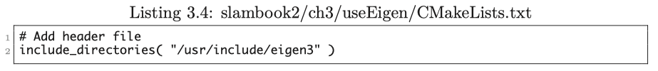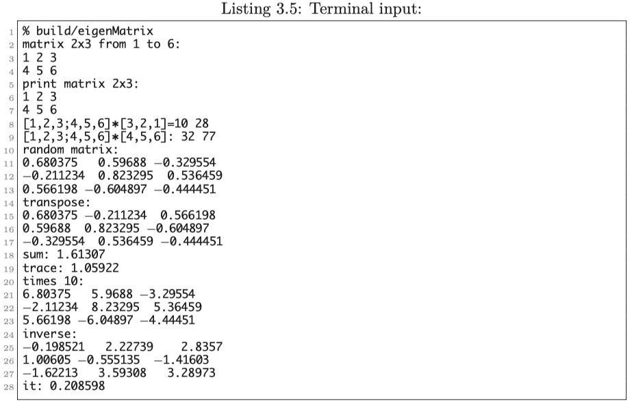 이 예제는 Eigen 행렬의 기본 연산과 연산을 보여줍니다. 이것을 컴파일하기 위해서는 CMakeLists.txt에 Eigen의 헤더 파일 디렉터리를 지정해야 합니다 :