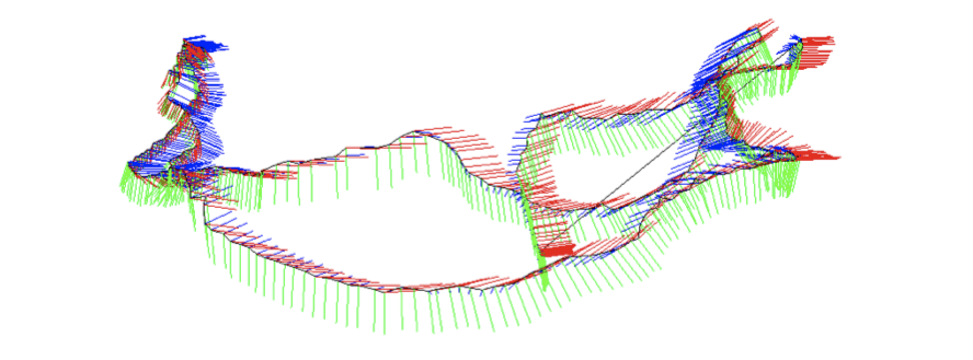 이 프로그램은 Pangolin에서 3D 포즈를 그리는 방법을 보여줍니다. 우리는 빨간색, 녹색 및 파란색으로 각 포즈의 세 축을 그립니다 (실제로 각 축의 세계 좌표를 계산 한 다음, 포즈를 검은색 선으로 연결합니다.) 결과는 그림 3-3에 나와 있습니다.