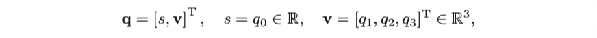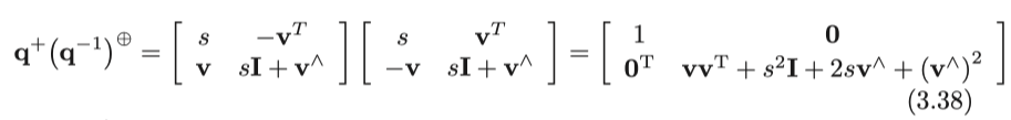 임의의 단위 쿼터니언은 회전을 설명하며 회전 행렬 또는 회전 벡터로 설명될 수도 있습니다. 이제 쿼터니언과 회전 벡터 / 행렬 간의 변환 관계를 살펴보겠습니다. 그전에 쿼터니언 곱셈은 매트릭스 곱셈으로 작성될 수도 있음을 인지해야합니다. $\mathbf{q}=[s,\mathbf{v}]^\mathrm{T}$라고 할때, $^{+}$ 와 $^{\oplus}$ 기호를 정의합니다 [20].