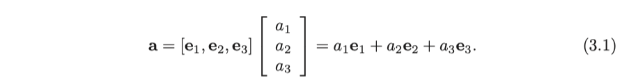 예를 들어, 3차원 공간에서 벡터의 좌표는 $\mathbb{R}^3$ 의 세 숫자로 설명 할 수 있습니다. 우리가 선형 공간에 있다고 가정해보면, 기초가 되는 좌표계인 $ (\mathbf{e}_1,\mathbf{e}_2,\mathbf{e}_3) $ 를 찾을 수 있습니다. 기초가되는 좌표계를 결정하면 이 기본 집합에서 벡터 a의 좌표를 말할 수 있습니다.