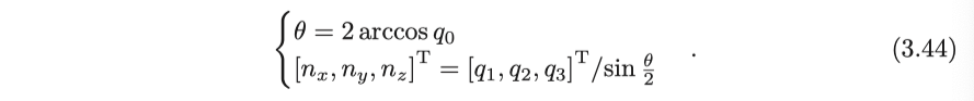 회전축의 경우 식 (3.38)에서 $\mathbf{q}$의 imaginary 부분을 $\mathbf{p}$로 교체하면 $\mathbf{q}$의 imaginary 부분이 회전 할 때 움직이지 않는 부분을 쉽게 알 수 있습니다. 즉, 정확히 회전 축을 구성합니다. $\mathbf{q}$의 imaginary 부분을 정규화하여 회전축을 얻을 수 있습니다. 요약하면, 쿼터니언에서 회전 벡터로의 전환 공식은 다음과 같이 작성할 수 있습니다.
