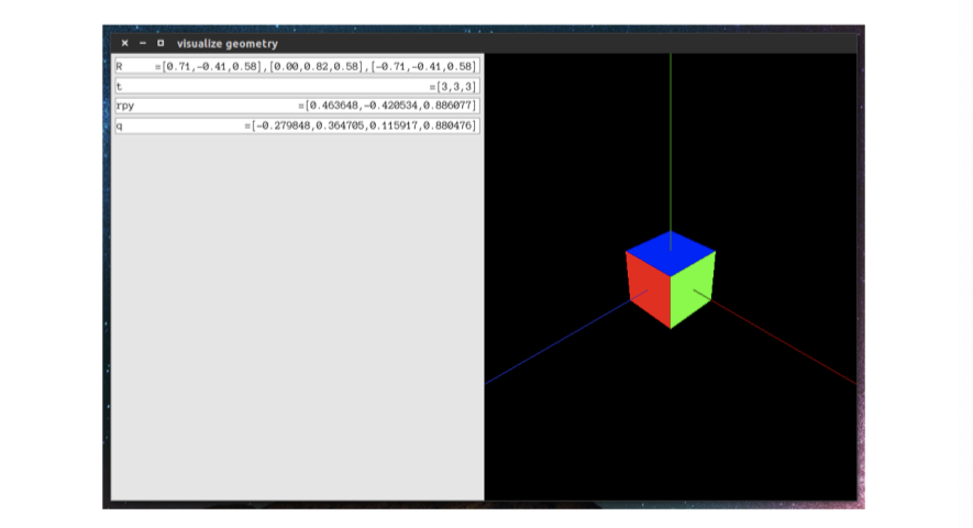 회전 및 이동의 개념을 처음 사용하는 경우 양식이 조금 복잡해 보인다는 것을 알게 될 것입니다. 많은 표현 방법이 있으며 필요한 경우 기본적으로 선호하는 것으로 변환해야 합니다. 다행스럽게도 회전 및 변환 행렬의 값이 충분히 직관적이지 않을 수 있지만, 우리는 이를 3D 창에서 쉽게 그릴 수 있습니다.