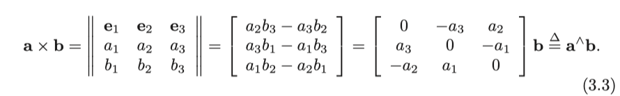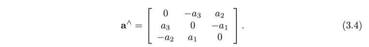 기호 ^는 반대칭 변환에 대한 벡터이며 식 (3.3)을 참조하십시오 (벡터의 외적 표현). 반대의 연산도 다음의 수식을 이용해 계산할 수 있습니다.