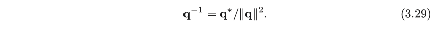 q가 단위 쿼터니언이면 이것의 inverse와 conjugate는 같습니다. 동시에 곱셈의 inverse는 행렬과 비슷한 특성을 갖습니다.