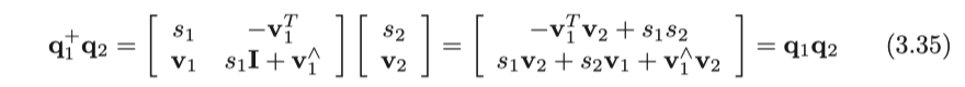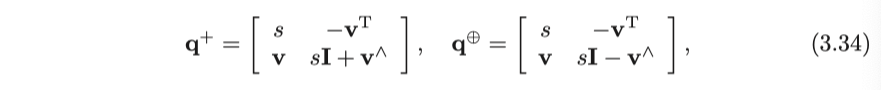 임의의 단위 쿼터니언은 회전을 설명하며 회전 행렬 또는 회전 벡터로 설명될 수도 있습니다. 이제 쿼터니언과 회전 벡터 / 행렬 간의 변환 관계를 살펴보겠습니다. 그전에 쿼터니언 곱셈은 매트릭스 곱셈으로 작성될 수도 있음을 인지해야합니다. $\mathbf{q}=[s,\mathbf{v}]^\mathrm{T}$라고 할때, $^{+}$ 와 $^{\oplus}$ 기호를 정의합니다 [20].
