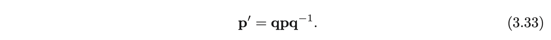 먼저, 3차원 점은 imaginary 쿼터니언으로 표현됩니다. 그러면 회전된 점 $ \mathbf {p}' $는 다음과 같은 곱셈으로 표현될 수 있습니다.
