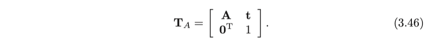 이러한 형식은 여러 개의 변환이 연속적으로 진행되면 식이 너무 복잡해집니다. 따라서 homogeneous 좌표와 변환 행렬을 도입하여 식 (3.9)를 다음과 같이 다시 쓰고자 합니다.