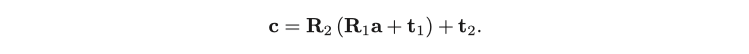 이것은 하나의 수학적 기법입니다. 3D 벡터의 끝 부분에 1을 추가하고 homogeneous 좌표라는 4D 벡터로 변환합니다. 이러한 4차원 벡터의 경우 회전 및 이동 변환을 행렬로 작성하여 전체 관계를 선형으로 만들 수 있습니다. 이 공식에서 행렬 T는 변환 행렬이라고 부릅니다. 우리는 여기서 $ \mathbf {a} $의 Hhomogeneous 좌표를 나타내기 위해 $ \tilde { \mathbf {a} } $를 사용합니다. 그런 다음 homogeneous 좌표와 변형 행렬을 활용하여 연속적인 두 변환은 다음의 간략화된 형태로 표현할 수 있습니다.