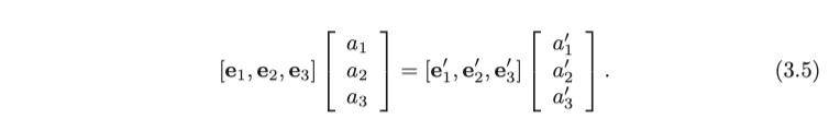 이러한 유클리드 변환은 회전과 변환의 두 부분으로 구성됩니다. 먼저 회전을 고려해봅시다. 우리는 단위 길이의 정규 직교 기저 $ ( \mathbf {e}_ 1, \mathbf {e}_ 2, \mathbf {e}_ 3 ) $ 설정하고 이 기저의 회전 후를 $ ( \mathbf {e}_ 1 ', \mathbf {e}_ 2 ', \mathbf {e}_ 3 ') $로 설정할수 있습니다. 그런 다음 동일한 벡터 a에 대해 각각의 두 좌표계에서의 좌표는 $ [a_ 1, a_ 2, a_ 3 ] ^ \mathrm {T} $ 와 $[a'_ 1, a'_ 2, a'_ 3 ]^ \mathrm {T} $로 나타낼 수 있습니다.