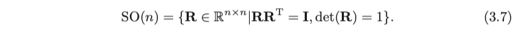 회전 행렬에는 몇 가지 특별한 속성이 있습니다. 첫 번째로 회전 행렬은 행렬식의 값이 1인 직교 행렬입니다. 반대로 말해서, 이러한 행렬식을 갖는 직교 행렬은 회전 행렬이라고 할 수 있습니다. 따라서 다음과 같이 n 차원 회전 행렬 모음을 정의할 수 있습니다.
